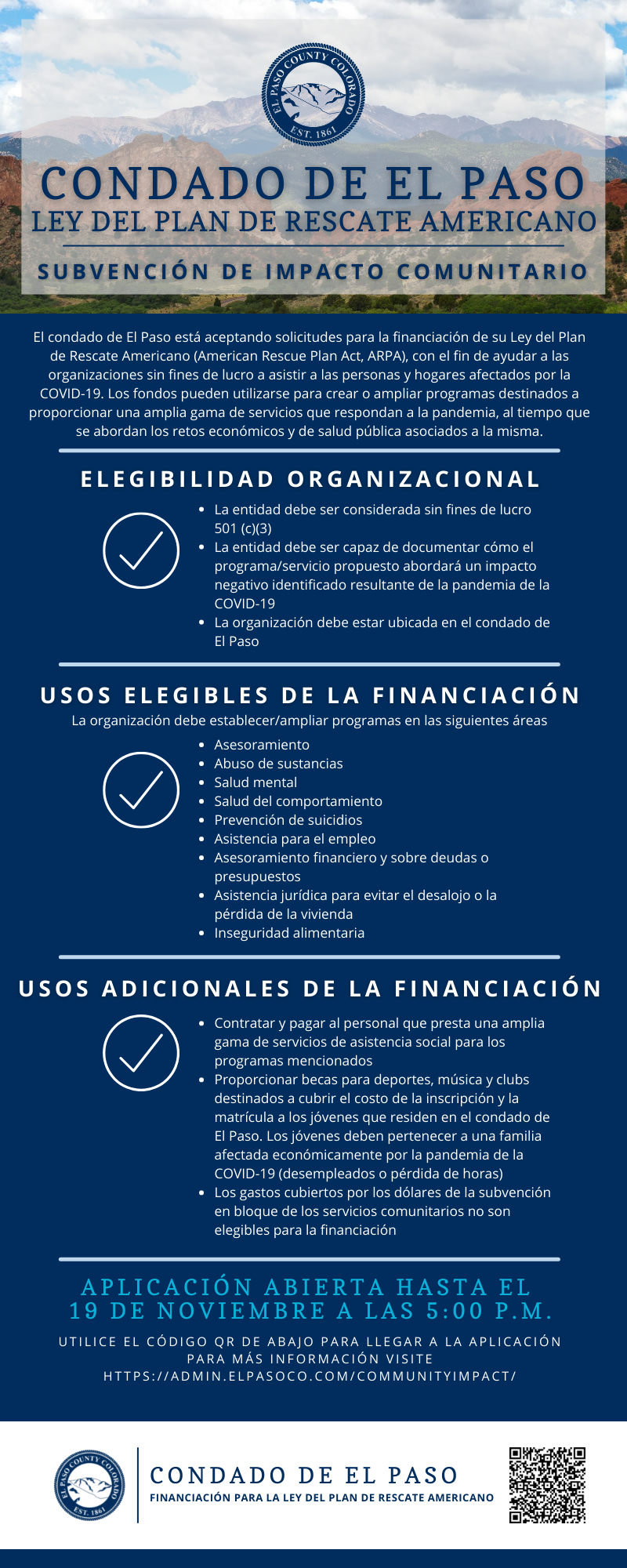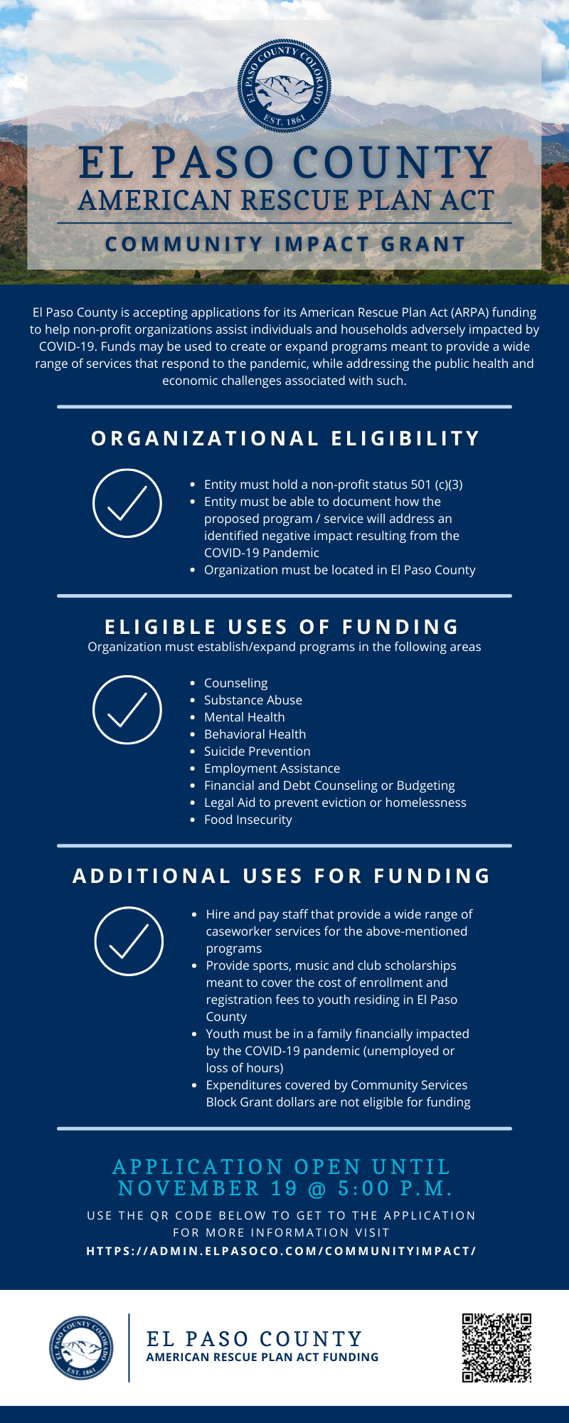 - Funds may be used to provide sports, music and club scholarships meant to cover the cost of enrollment and registration fees to youth residing in El Paso County. Youth must be in a family financially impacted by the COVID-19 pandemic (unemployed or loss of hours)